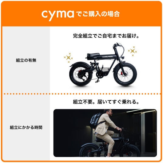 cymaサイトで購入の自転車はすべての車両において、プロのメカニックが検品・メンテナンスを行った上で出荷しているため、購入後組立不要で、届いてすぐ安心して自転車に乗ることができます。