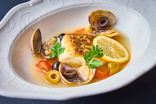 身が締まって歯ごたえのある愛媛県産の天然鯛を、素材の味を最大限に活かすアクアパッツァでご提供します。魚介の旨みが凝縮されたスープに愛媛県岩城島産"いわぎレモン''の香りと酸味でアクセントをつけた、味わい深い一皿です。