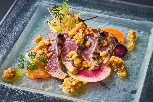香川県産鰹の炙り 燻し香を纏わせて ヘーゼルナッツを効かせたヴィネグレット 香味野菜添え¥2,800