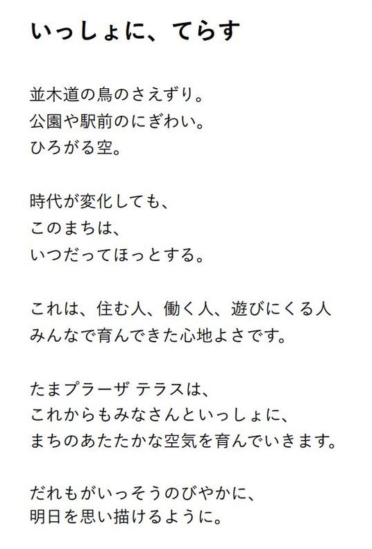当施設は、アニバーサリー期間を通して、訪れるお客さまや地域の皆さまへ、感謝の気持ちを発信し、心地よい場所を提供し続け、皆さまと共にたまプラーザの未来へ向かってあたたかな空気で育んでまいります。