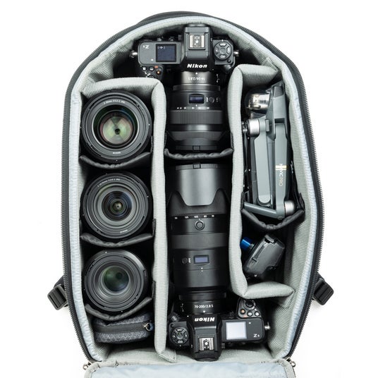 バッグの素材にもこだわり、ファスナーは安心感のあるYKK製で、バッグ表面には主に1680Dバリスティックナイロンと420Dリップストップナイロンを採用。バッグ背面には通気性に優れたウルトラスパンデュラとエアメッシュ生地を使用し、過酷な撮影環境にも耐えうる丈夫さと、快適な背負い心地を両立しています。