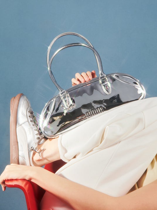 人気のボストンバッグをemmiだけの横長デザインとメタリック素材に変更。ファスナー部分もシルバーにすることでモードな印象に。内側はPUMAロゴの総柄生地にemmiのネームつき。