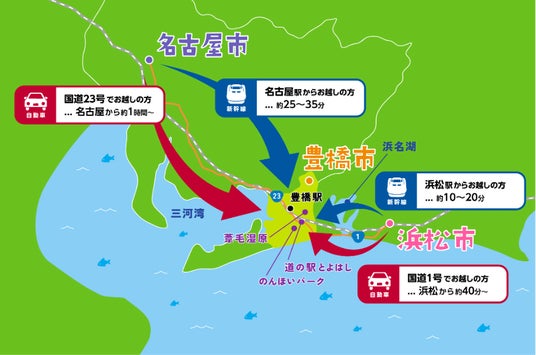 2025年3月7日の国道23号名豊道路の全面開通により、豊橋市は名古屋から自動車で約1時間とアクセスが良くなりました。