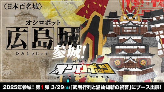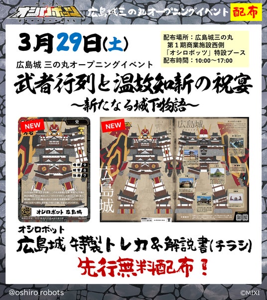 株式会社MIXI(東京都渋谷区、代表取締役社長 上級執行役員 CEO:木村 弘毅)は、MIXI_ANIMEオリジナルコンテンツ『城郭合体オシロボッツ』のオシロボット「広島城」を本日公開しました。また、2025年3月29日(土)広島城三の丸オープニングイベント「武者行列と温故知新の祝宴~新たなる城下物語~」にブース出展し、オシロボット広島城のトレーディングカードと解説書を配布します。