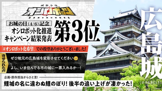 オシロボット「広島城」の参城により、2023年4月に実施した「オシロボット化推進投票」の1位(松本城)、2位(名古屋城)、3位(広島城)、すべてのオシロボット化が完了しました。