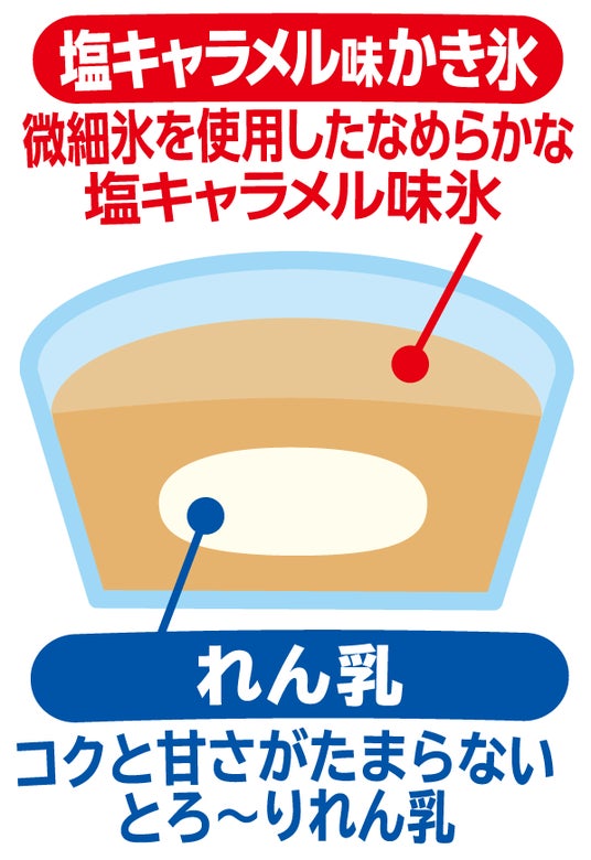 「森永れん乳氷 塩キャラメル」は、氷粒の細かい微細氷を使用した塩キャラメル味のかき氷の中に、れん乳を入れた、甘じょっぱい味わいと濃厚でなめらかな食感が楽しめるカップアイスです。