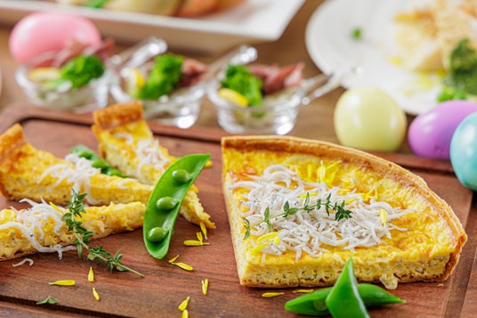 ▲玉ねぎとしらすのキッシュ スナップエンドウ豆を飾って