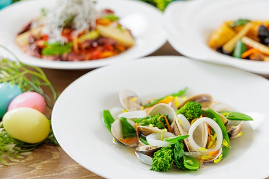 温菜には、 蛤の旨みが凝縮したスープ仕立ての「蛤と春野菜のナージュ」、甘みの増した新玉葱のピューレとともに味わう「ポークグリル」、香ばしく焼き上げた「焼きアスパラガスと焼き筍」など、春ならではの味覚を存分に味わえるメニューが揃います。冷菜では、春の訪れを感じる「菜の花とホタルイカを使用したマリネ」、バジルが香る「春筍の冷製料理」、玉葱としらすをたっぷり使った「キッシュ」など、目にも鮮やかな一皿が並びます。