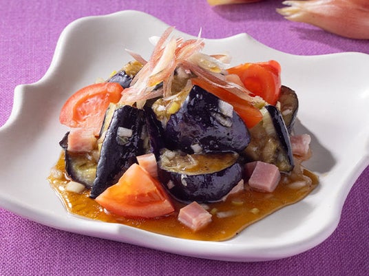 ナス、トマト、ベーコンを刻み葱と醬油ベースのドレッシングでマリネし、アクセントに茗荷を加えました。