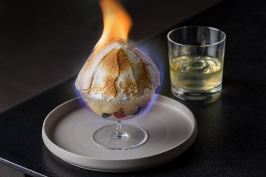 焼き氷とともに味わうのは白州ウイスキーです。かき氷でも使用している純度の高い氷を入れて、ロックスタイルで味わいます。氷が解けるにつれて感じるまろやかな味わいや複雑な香りの変化を楽しめるのが特徴です。さらに、かき氷と合わせることで、フランベされたメレンゲの香ばしさと、白州ウイスキーならではの繊細な甘みが加わり、深みのあるの味わいを堪能します。