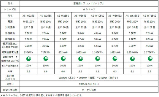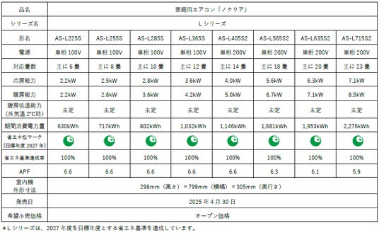 当社は、国内向け家庭用エアコン「ノクリア」のミドルクラスとして、Wシリーズの新モデルと、新ラインアップとなるLシリーズをそれぞれ2025年3月31日(月)、4月30日(水)より順次発売します。両シリーズは、清潔機能を強化するとともに、高い省エネ性能とスマートなデザインを兼ね備えた、お客さまの幅広いニーズにお応えする製品です。