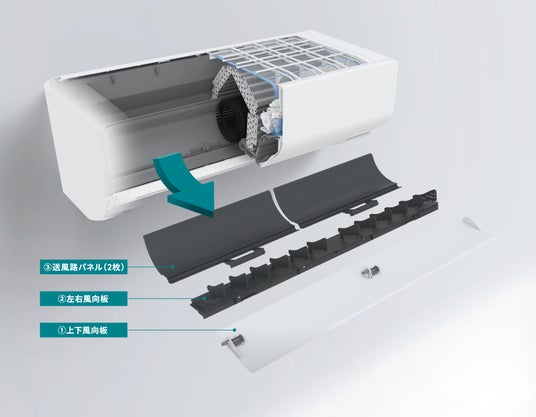 ※1 国内壁掛形家庭用エアコンにおいて。送風路が着脱可能な構造。2025年3月31日発売予定。(3月1日現在 当社調べ。)