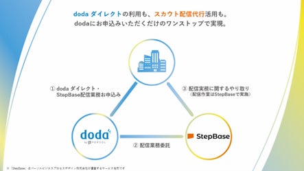 「はたらいて、笑おう。」をビジョンに掲げるパーソルグループのパーソルビジネスプロセスデザイン株式会社(東京都港区、代表取締役社長:市村 和幸、以下「パーソルビジネスプロセスデザイン」)は、バックオフィス業務の運用を支援する中小企業向けオンラインBPOサービス「StepBase」において、グループ会社のパーソルキャリア株式会社(東京都港区、代表取締役社長:瀬野尾 裕、以下「パーソルキャリア」)が運営する国内最大級のスカウトサービス「dodaダイレクト」との連携を2025年4月1日より開始します。これにより、「dodaダイレクト」のユーザー企業は、これまで採用担当者が対応していたスカウト対象者に対する「求人票の作成」や「スカウトメールの配信」などのスカウト業務をStepBaseに委託することができるため、採用担当者の工数を大幅に削減することが可能になります。