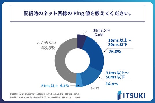 続いて、配信時、現在のネット回線に少なからず満足していると回答された方に「配信時のネット回線のPing値」を問う設問への回答では、1位が「わからない」で48.8%、2位が「16ms以上~30ms以下」で26.0%、3位が「31ms以上~50ms以下」で14.8%という結果になりました。「わからない」と回答された方も半数近くいたものの、この結果から配信時のPing値は「30ms以下」の通信環境を整えている人が多いことがわかりました。