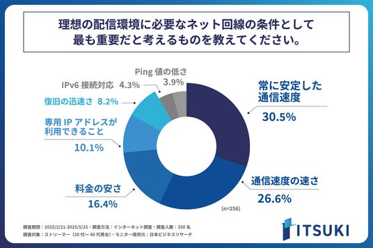 調査の最後、配信の質向上や視聴者数の増加を目指す上で、ネット回線が及ぼす影響は大きいと感じていると回答された方に「理想の配信環境に必要なネット回線の条件として最も重要だと考えるもの」を尋ねる設問への回答では、1位が「常に安定した通信速度」で30.5%、2位が「通信速度の速さ」で26.6%、3位が「料金の安さ」で16.4%という結果になりました。この結果から、多くの人が「常に安定した通信速度」が最も重要だと考えていることがわかりました。