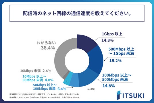 また、配信時、現在のネット回線に少なからず満足していると回答された方に「配信時のネット回線の通信速度」を尋ねる設問への回答では、1位が「わからない」で38.4%、2位が「500Mbps以上~1Gbps未満」で19.2%、3位が「1Gbps以上」で14.8%という結果になりました。この結果から、「わからない」と回答された方も多いものの、通信速度は500Mbps以上の通信環境を整えている人が多いことが判明しました。