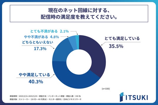 次に、「現在のネット回線に対する、配信時の満足度」を尋ねる設問の回答では、1位が「やや満足している」で40.3%、2位が「とても満足している」で35.5%という結果になりました。1位と2位の回答を合計すると、回答率75%を超える形となり、75%以上の人が、配信時、現在のネット回線に少なからず満足していることがわかりました。