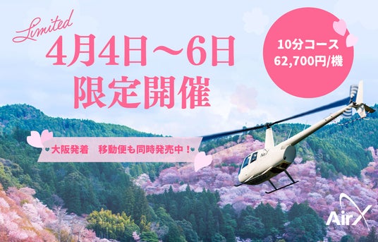 株式会社AirX(本社:東京都千代田区、代表取締役:手塚究、以下「AirX」)は、2025年4月4日(金)から6日(日)の3日間限定で、切抜ヘリポート(所在地:奈良県)を発着地とするヘリコプター遊覧プランの販売を開始いたします。本プランでは、日本有数の桜の名所である奈良県吉野山の桜を、上空から鑑賞する特別な体験を提供いたします。切抜ヘリポート発着での遊覧は、AirXとして初の試みです。