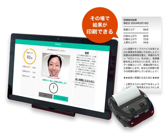 タブレット端末のカメラに向かって5秒間笑顔を向けると「口角の上り」「口幅の広がり」「上唇の上り」から笑顔スコアが算出されます。