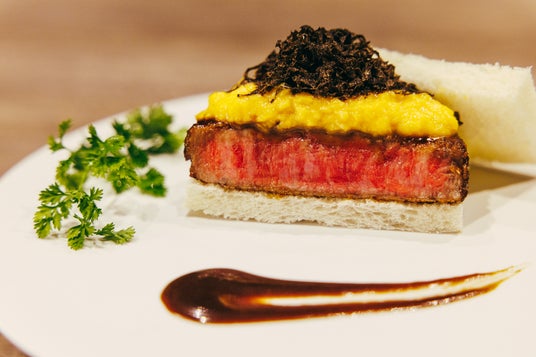 絶妙な加減で火入れしたレアの牛ヒレカツに特製トリュフソースを纏わせて、トロトロたまごと一緒にモッチリとしたパンでサンドイッチにしました。目の前でふわふわに削ったトリュフを添えて仕上げる「うしごろ」定番カツサンドの最新作です。