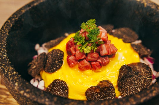 熱々の石鍋から立ち昇る芳醇なトリュフと醤油ダレの焦げる香りに加えて、美味しい音色が食欲をそそります。カリッとした"おこげ"の香ばしい味わいと食感を存分に味わうことができる、トリュフを贅沢に使用した梅田店限定の石焼ビビンバです。