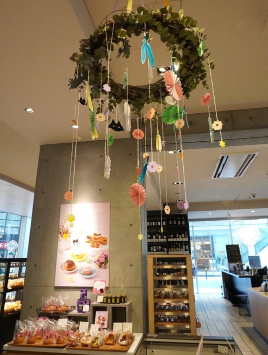 ▼芽吹いた花を模した装飾で鮮やかに彩られ、春の訪れを感じさせる店内