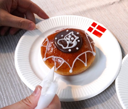 ファステラウンに欠かせないパン「ファステラウンボーラ」に、アイシングで思い思いの絵を描きました。ベーカー長から、デンマークでのファステラウンの様子を聞きながら、その場でクリームたっぷりのパンを味わいました。