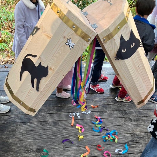 木製の樽にはファステラウンのモチーフである黒猫が描かれ、集まったお子さまたちは順番に樽たたきを行いました。ようやく樽が割れると、中からカラフルな飾りやボールがこぼれ出てきます。そのボールと引き換えに、子どもたちは広島アンデルセンのソフトクリームやキッズバスケットのチケットを受け取りました。