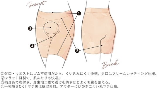 補正が無く締め付けにくさにこだわったロング丈ショーツの夏バージョン。「アウター対応・汗べたつき対策のため、ロング丈のガードルを着用しているが、補正や苦しいのは苦手。」そんなお客様の声から開発。「汗対策や安定感のために、お腹まわりや股下がもう少し長ければ・・・」お客様や社内愛用者から声をいただき、規格寸法を再検討したロング丈ショーツです。