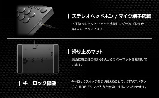 ■ステレオヘッドホン / マイク端子搭載 お手持ちのヘッドセットを接続してゲームプレイを楽しむことができます。■滑り止めマット 底面に安定性の高い滑り止めラバーマットを採用しています。■キーロック機能 キーロックスイッチを切り替えることで、STARTボタン / GUIDEボタンの入力を無効にすることができます。