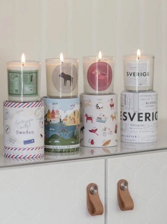 [クリンタ]キャンドルの溶けたロウがマッサージオイルになるスキンケアキャンドルです。SWEDISHシリーズは、スウェーデンの挨拶や風景のパッケージが贈り物としても好適です。マッサージキャンドル SWEDISHシリーズ各種 約7×高さ8.5cm 各7,700円