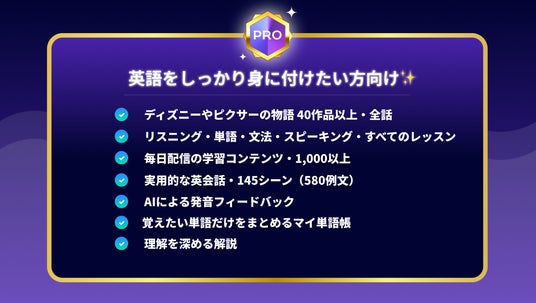 本アプリは、ディズニーやピクサーの作品で英語が学べる、大人向け英語学習アプリです。ながら学習、スキマ学習に最適な「聞くだけ」から気軽に始められ、スピーキング力の向上にも効果が期待できます。デジタルリワードで学習の継続をサポート、英語初級者の方でも楽しみながら英語学習を続けやすいのが特長です。