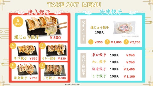 大間々店では、テイクアウトのみの販売となり全5種の餃子を焼き餃子・冷凍餃子でご提供いたします。