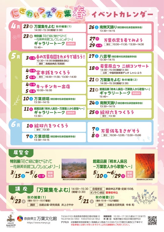 万葉文化館では4/23(水)~6/8(日)の間、「にぎわいフェスタ万葉 春」を開催します。