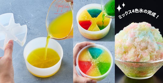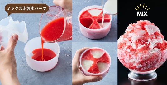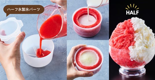 牛乳やジュースなどを凍らせた味付き氷や、市販の冷凍フルーツにも対応しています。また、専用製氷カップに加えて、ふたつの味を1度に削れる製氷パーツが付属し、ハーフ氷やミックス氷まで、バリエーション豊かに!味わいや材料を色々組み合わせることで、アレンジしながら自分好みのオリジナルかき氷を楽しむことができます。