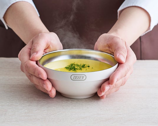 「Toffy スタッキング真空断熱ステンレスボウル」は、真空機能を備えたダブルウォール構造のステンレスボウルです。外側が結露しにくく、ひんやりデザートのカップに最適。熱い料理を入れたときは外側が熱くならないので持ちやすく、季節や使用シーンを問わずに一年を通してお使いいただけます。また、スタッキング構造で収納もすっきりコンパクトに。カラーはやさしい色味の「パンナホワイト」。お料理を引き立てるカラーリングです。