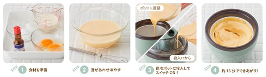 8時間ほど冷凍庫で冷やした保冷ポットに、お好みの食材を投入しスイッチを押すだけ。パドルが回転し、食材を冷やしながら混ぜ合わせます。通常なら手間がかかるアイスクリーム作りも、約15分で完成!簡単操作だから、お子さまと一緒にアイスクリーム作りを楽しめます。また、撹拌の途中でふたの食材投入口から食材を追加できるため、トッピングでアレンジも可能。