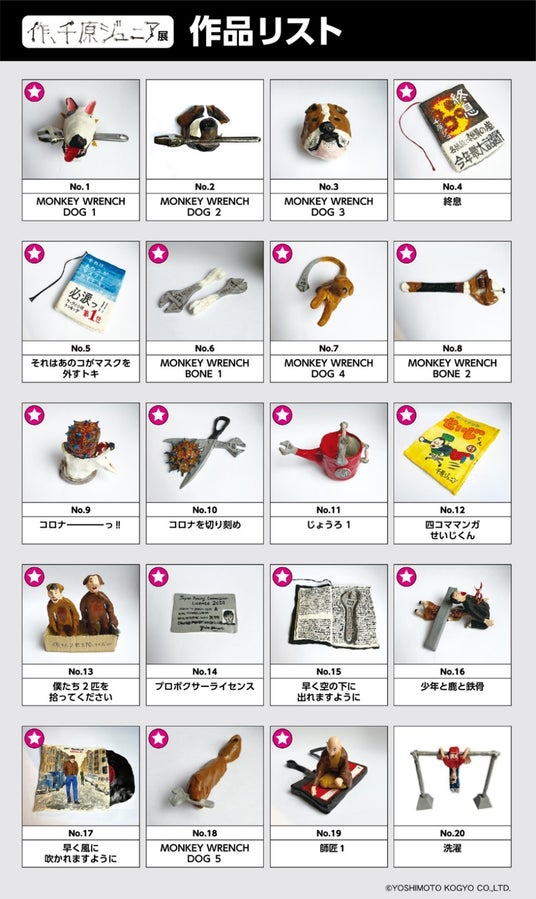 「イントロダクション」では千原ジュニアの歴史、「作、笑」では千原ジュニア本人が過去に作ったネタやコントライブ、大喜利、テレビ企画、Youtube企画からここでしか見られない資料を展示します。「作、アート」では人気番組プレバトで制作した作品から選りすぐりの作品を展示します。