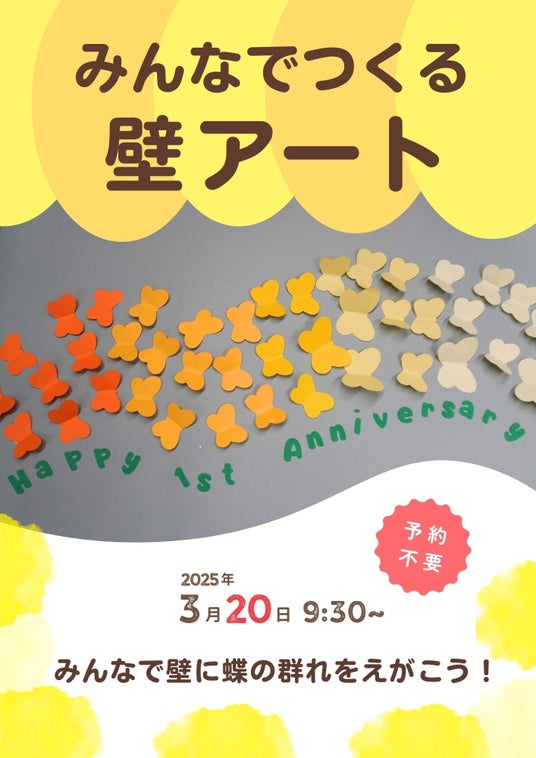 熊本県立図書館内連絡通路に利用者参加型の壁アートを制作します。来館者の皆さんに紙の蝶を貼っていただき、皆でアートを作っていきます。