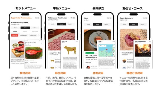 5か国語(英語、韓国語、中国語簡体字・繁体字、タイ語)対応の多言語メニューに加え、食材、産地、調理法に関する情報を多言語で提供するだけでなく、日々の仕入れに応じたコースや盛り合わせメニューの内容にも対応可能です。特に、18,000種類以上の日本酒情報を備えており、実際の飲食店で提供される酒類情報を多言語で提供できます。また、販売単位(ボトル、一合、二合、徳利)ごとの価格設定も可能です。