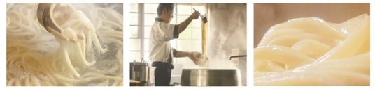 100%国産小麦、塩、水のみから、麺職人が真剣な眼差しで打つうどん。ひとつひとつの工程を麺職人が想いをこめて丁寧に行なっていくカットの後には、だしを引くためのこだわりの素材と、麺職人がだしを味見し自信にあふれる様子が映し出されます。だしが注がれると、立ち上る湯気がだしの香り高さを感じさせるカットになっています。