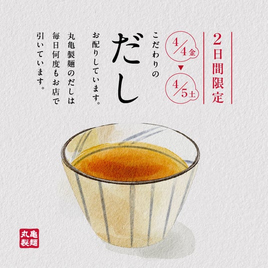 《4月4日(金)・5日(土)の2日間限定、全国の丸亀製麺でこだわりの"だし"を無料配布》
