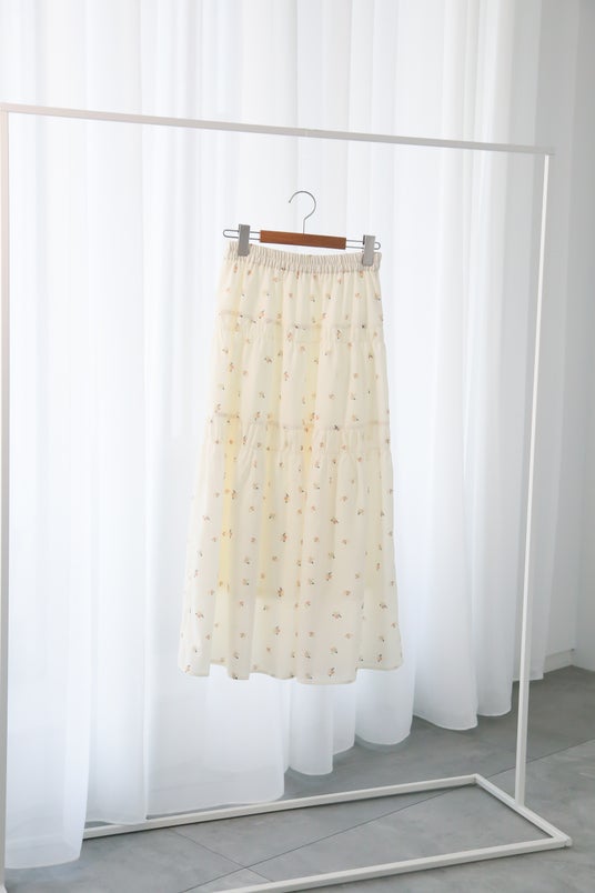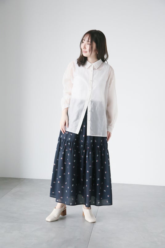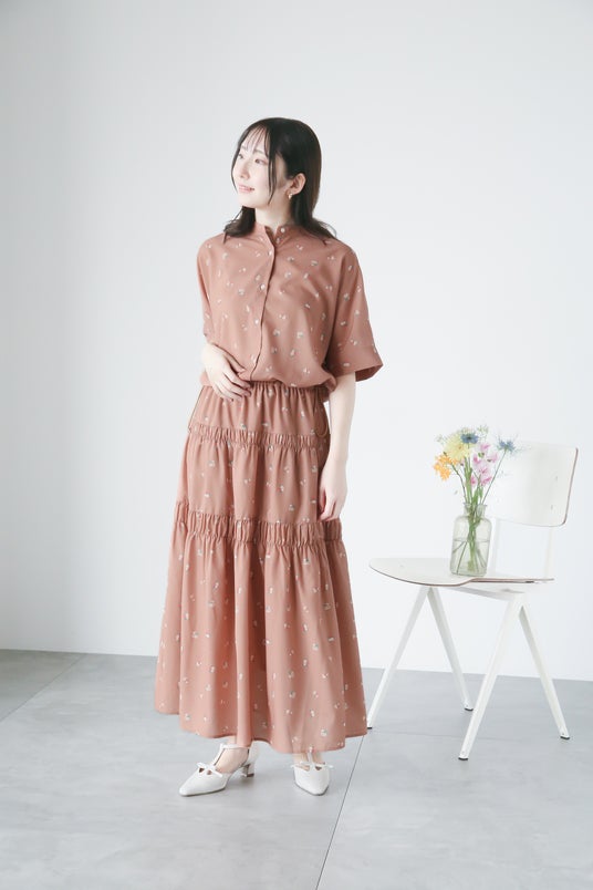 オリジナルの小花柄シャーリングスカート。シャーリングを2段にすることでふんわりとしてフェミニンな印象に。同素材のシャツとセットアップで着用するのもおすすめです。