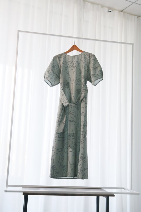 チューリップやリシアンサスなどを線画で表現したワンピースは、ランタンスリーブで女性らしい1枚に仕上げました。シックな色使いと刺繍見えするプリント使いが、上品な印象を演出。