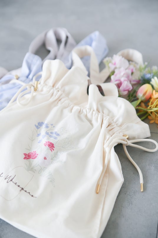 オリジナルのプリントを施した巾着型のバッグ。デザインもシンプルなので今回のコラボアイテムと相性抜群。マチがしっかりついており実用性も兼ね備えたデーリーに使いやすい1枚。