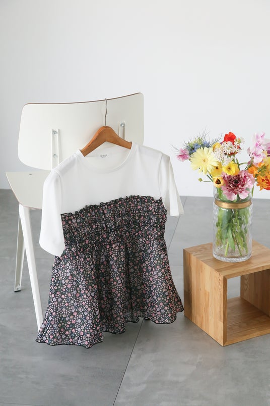 また、レイヤード風に仕立てたTシャツは、透け感のある素材にナデシコや勿忘草などの小花を鮮やかにプリント。胸元に施したシャーリングが、かろやかで華やかな雰囲気をプラスしてくれます。