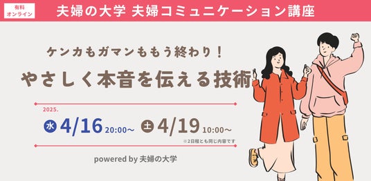 とはいえ、夫婦のコミュニケーションは意外と難しいものです。職場ではコミュニケーション能力が高いと思われていても、夫婦となると「うまくいかない!」という方も大勢いらっしゃいます。普段の人間関係とは異なる考え方・スキルが求められる"夫婦コミュニケーション"を「ふたりで」「体系的に」学んでおくことは、これからの長い結婚生活・夫婦関係のお守りのようなものになっていくでしょう。