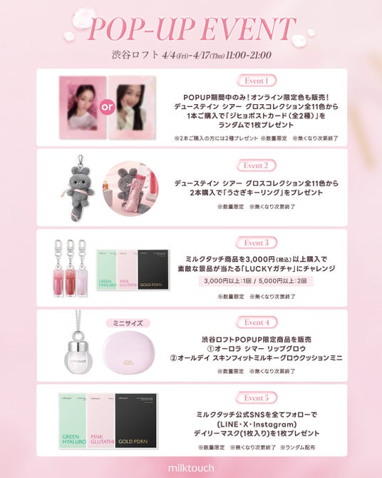 TWICE JIHYOがミューズを務める韓国コスメブランド「milktouch」が新商品「デューステインシアーグロスコレクション」の発売を記念したPOP-UP STOREを2025年4月4日より開催。