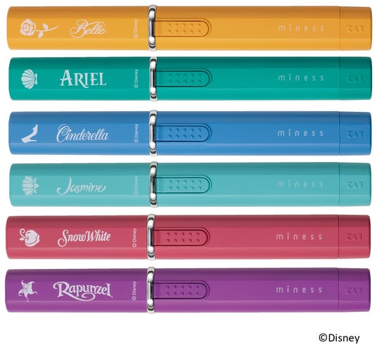 「ベル(美女と野獣)」「アリエル(リトルマーメイド)」「シンデレラ(シンデレラ)」「ジャスミン(アラジン)」「白雪姫(白雪姫)」「ラプンツェル(塔の上のラプンツェル)」の6人のプリンセスをモチーフにしたデザインが登場。プリンセスが描かれたパッケージに加え、本体色はそれぞれのプリンセスをイメージした色味になっており、大人の女性でも使いやすいワンポイントモチーフのデザインです。