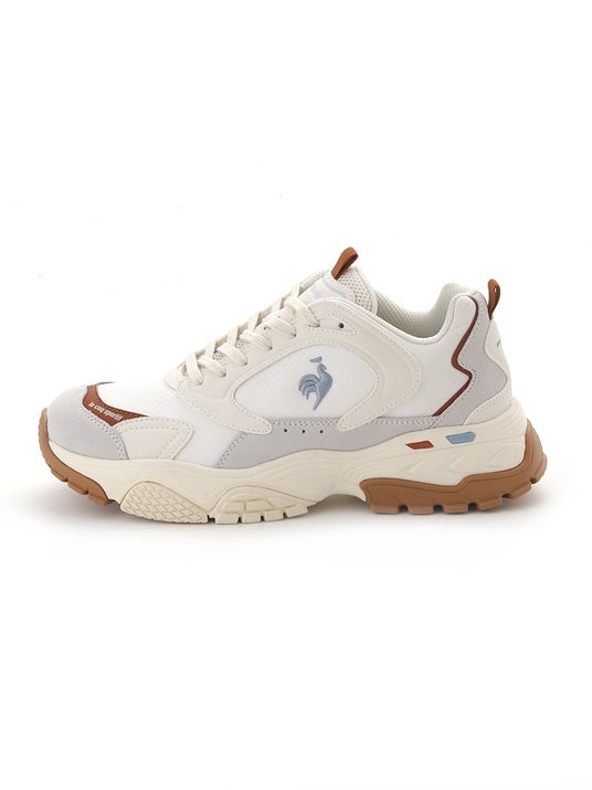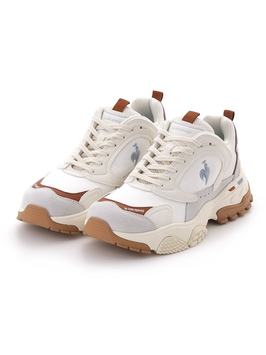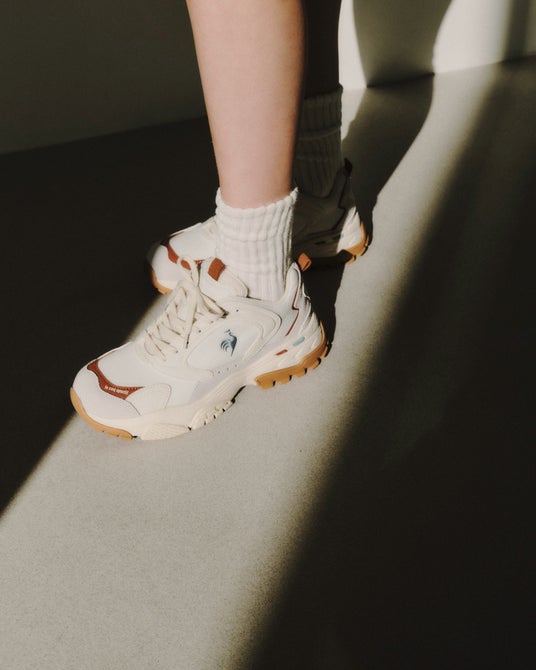 別注モデルは、春らしい爽やかなブルーとテラコッタの組み合わせに、メッシュ生地やスエードを加え、シンプルながら奥行きのあるアイテムに仕上げました。インソールにはemmiとle coq sportifのWロゴ入りの別注仕様。